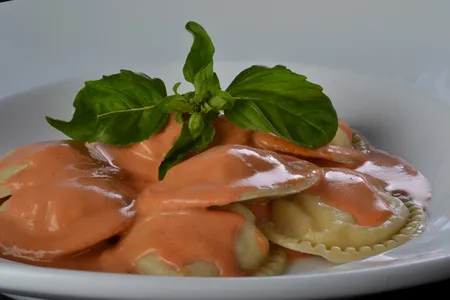 Pasta fresca casera rellena de mozzarella, ricota y jamón cocido, con suave salsa rosa